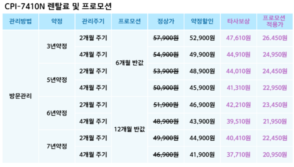 1666-9859 빠르고 간편한 렌탈 상담신청 개인정보 수집/이용 내용보기 동의 미동의 ※ 개인정보수집이용 동의 1. 개인정보의 수집 및 이용목적 : 원활한 렌탈 상담 및 주문을 위한 참조자료로 아래와 같은 항목의 개인정보를 수집하고 있습니다 2. 수집하려는 개인정보 항목 : 필수 수집항목 : 이름, 연락처 3. 개인정보의 보유 및 이용기간 : 수집된 정보는 이용자의 정보 삭제 요구 시까지 보관, 활용하며 수집 및 이용 목적이 달성된 후 해당 정보를 지체 없이 파기합니다. 단순 상담고객 3개월 후 파기 / 계약 고객 12개월 후 파기 4. 개인정보 취급 담당자 : 이름 : 이성용연락처 : 1666-9859 5. 개인정보 수집 동의거부 사항 : 이용자의 개인정보는 원활한 상담을 위해 수집하고 있으며, 동의하지 않을 경우 상담 및 주문이 제한됩니다. [닫기]